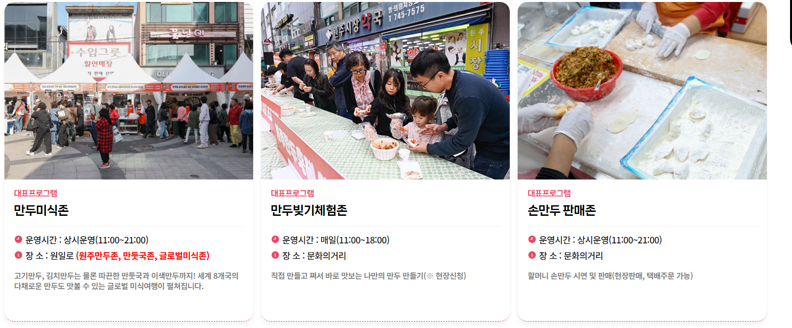 - 만두빚기·반죽 놀이터·빨리 빚기 대회 — 가족·관광객 참여형 프로그램으로 상시 운영.