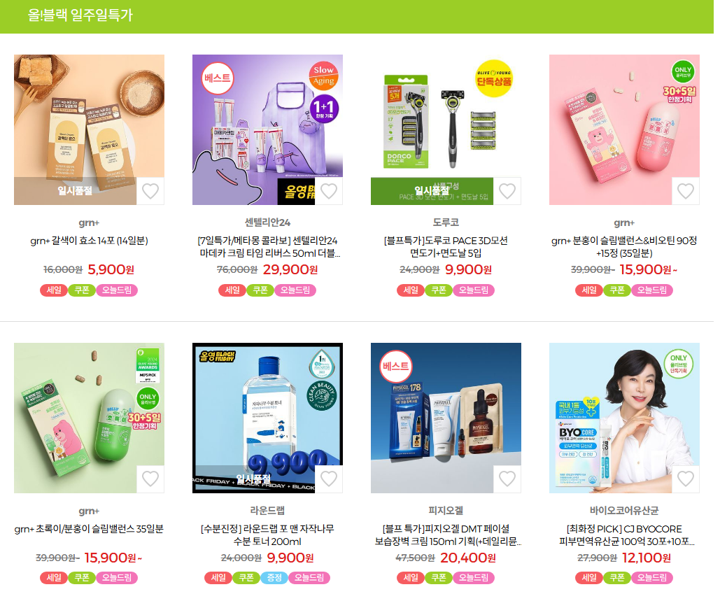 11월 한정 기획세트/콜라보 제품이 블프·올영픽 동시 전개로 나옵니다. “평소 안 내려오는 신상”은 블프가 사실상 첫 최저가가 되는 경우가 잦아요. - 오프라인 키트/사은품