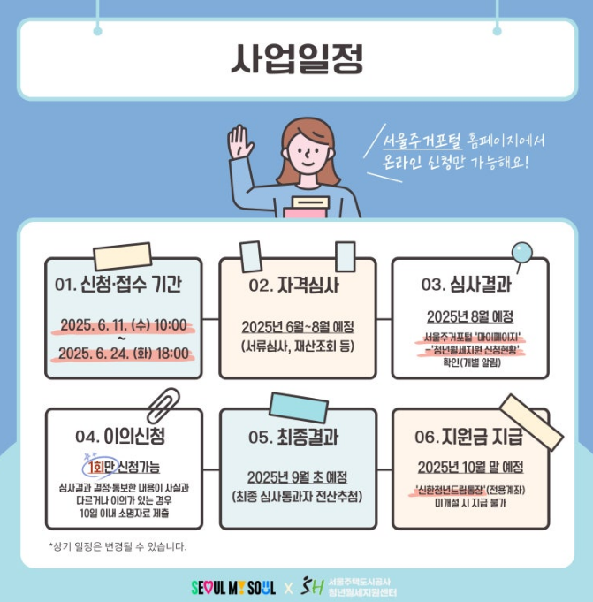신청 결과 확인은 서울청년포털 내 '나의 신청현황' 메뉴에서 가능하며, 승인 여부는 문자 및 이메일로도 개별 안내됩니다. 접수 이후 약 1~2개월 내 심사가 완료됩니다.