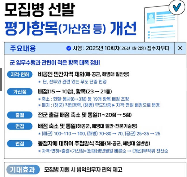 - 모집병 지원 시 병역의무자 편익 제고, 군 임무 수행과 연관성이 낮은 자격·면허 가산점, 무리한 가산점 항목 위주 선발 방식을 폐지하거나 축소합니다
