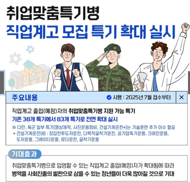 🛠 2. 취업맞춤특기병 제도 확대 – 직업계고 청년도 혜택 (2025년 7월 접수부터)