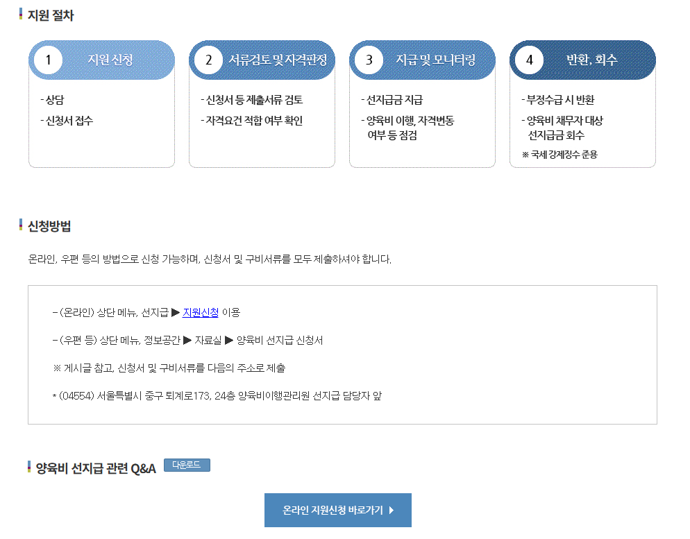 - 여성가족부 산하 양육비이행관리원 → 공식 홈페이지 또는 오프라인 접수