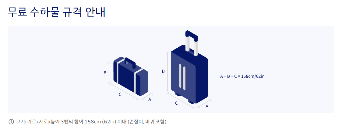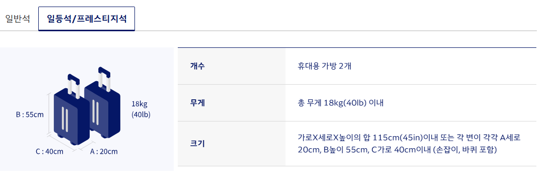 - 무게: 일반석 1개 12kg 이하 / 비즈니스석 이상 2개 합계 18kg 이하