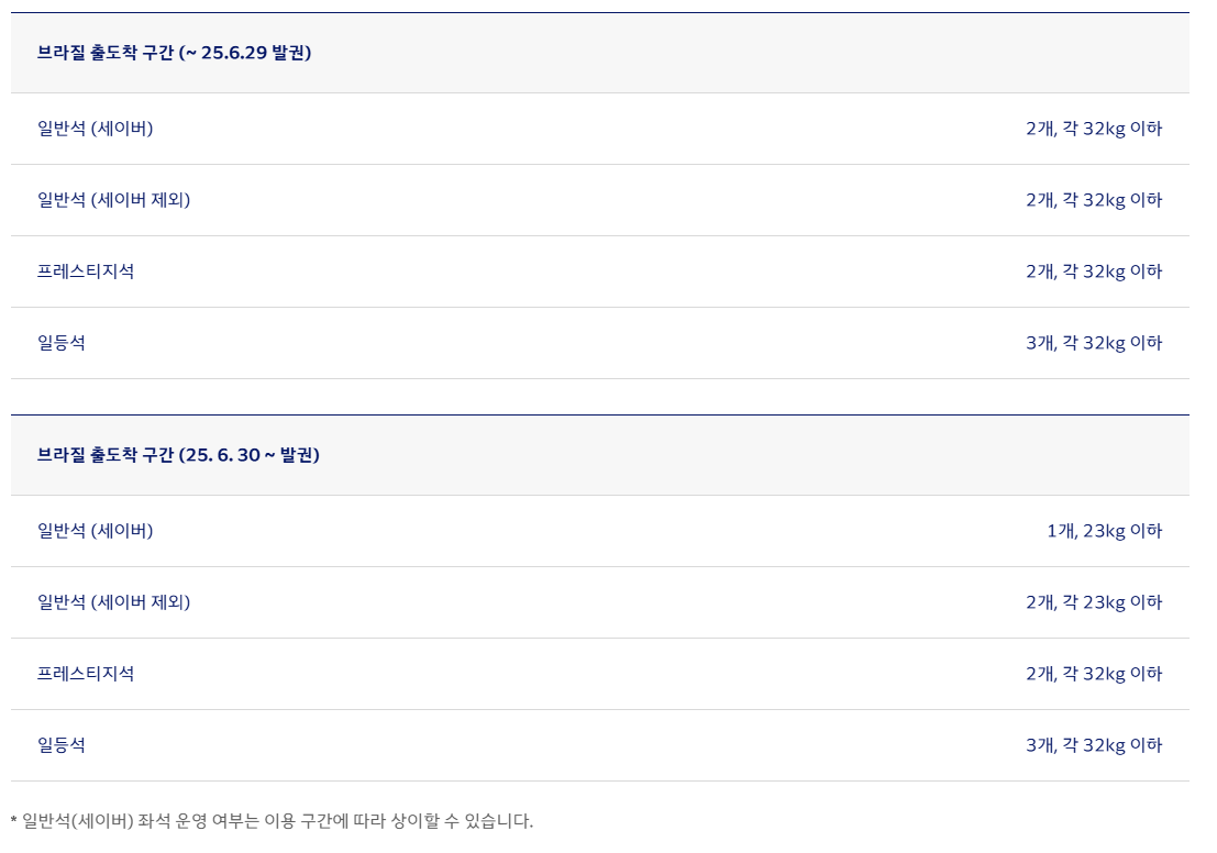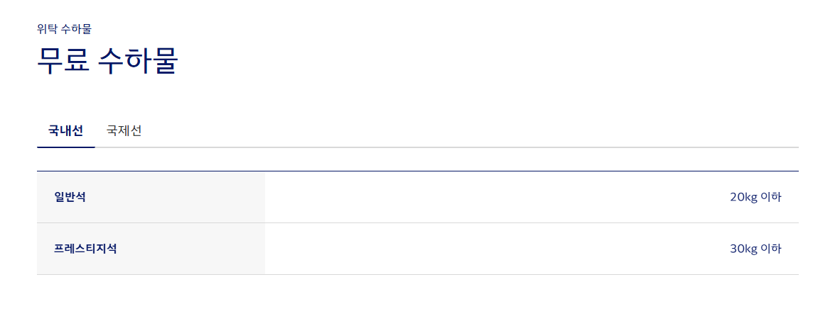 | 일반석 | 1개, 20kg 이내 |