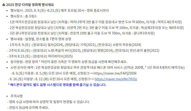 “2025 한강 다리밑 영화제”는 교각 아래로 펼쳐지는 시원한 영화 축제입니다.