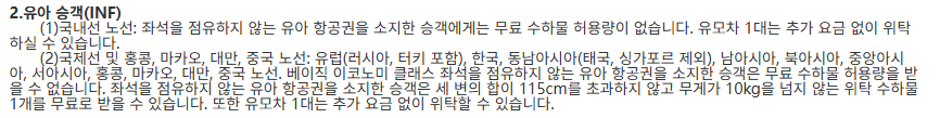 - 유아 동반 시 유모차(접이식, 55×40×20cm 이하) 기내 반입 가능(규격 초과 시 위탁).