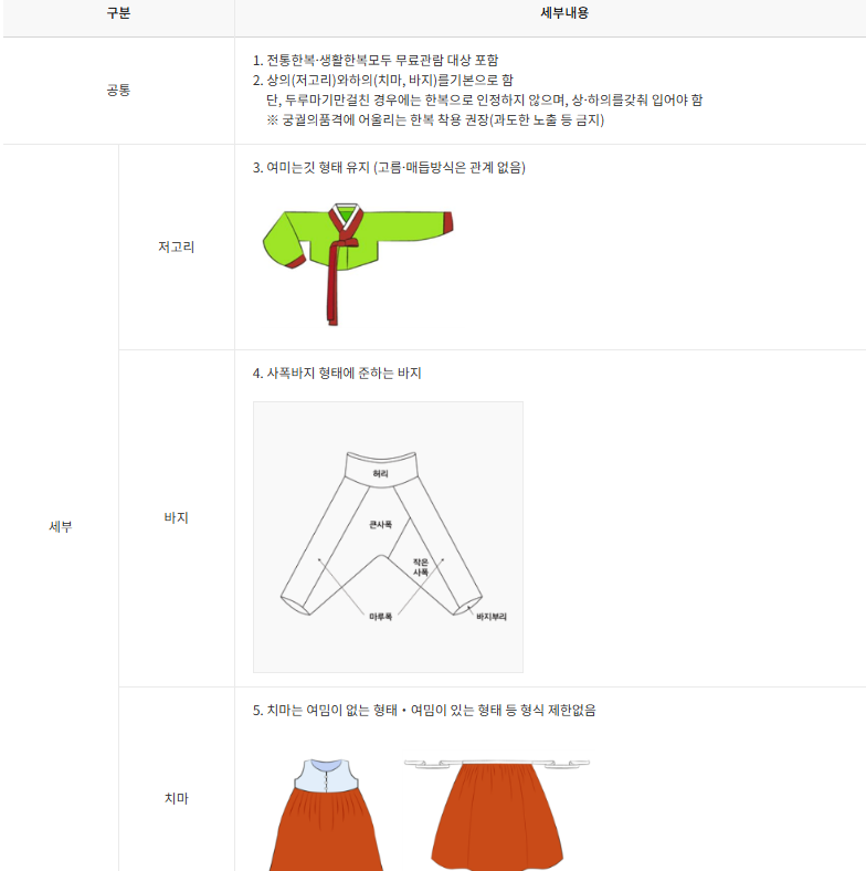 - 한복 착용자(가이드라인 적합 착용 필수, 미충족 시 입장 불가)