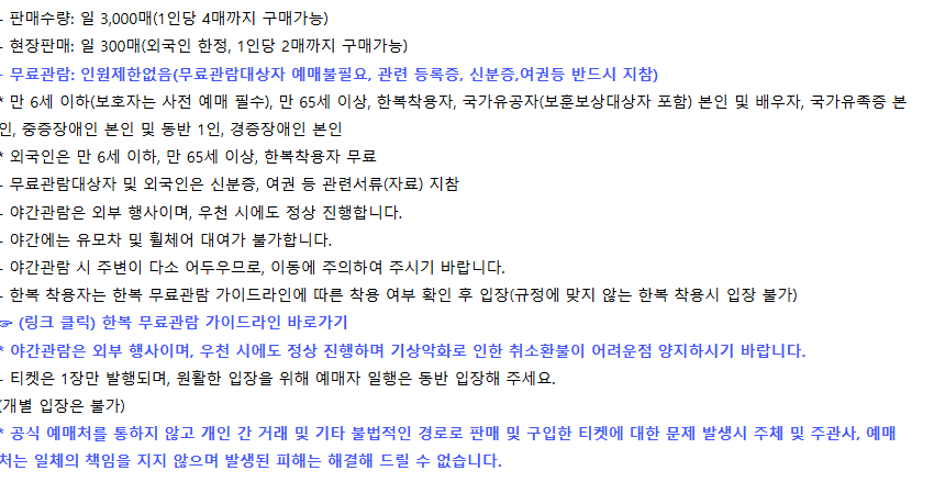 - 한복 전략: 예매 실패해도 한복 착용이면 무료·무예매 입장 가능(규정 준수). 단, 주말엔 줄이 길 수 있어 19시 이전 도착 권장.