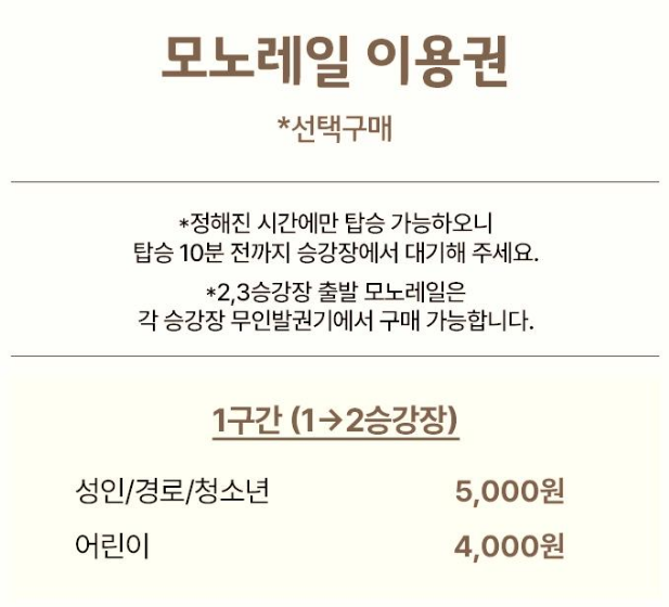 - 유의: 모노레일은 입석이며 중간 하차 불가. 노약자·임산부 동승 시 좌석 배려와 시간 엄수가 필요합니다.