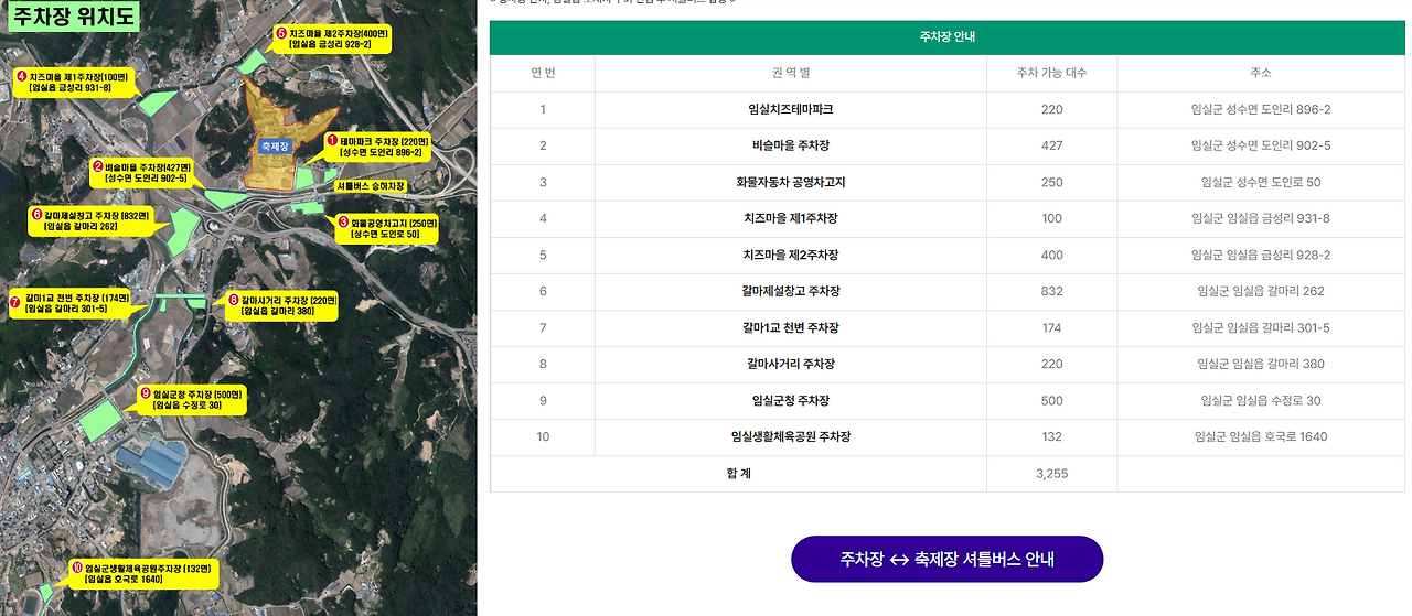 공식 안내에 따르면 축제 기간 주차장 10개소(총 약 3,200대 규모)가 운영됩니다. 임실치즈테마파크 인근 1·2·3 주차장과 셔틀버스 전용 주차장이 핵심이에요.
