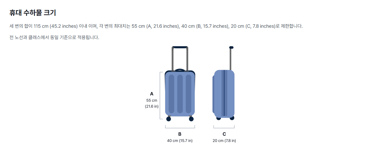 - 유모차(기내 반입): 완전 접이식이고 세 변 합 115cm 이내이면 현장 상황에 따라 기내 반입 또는 게이트 위탁 처리됩니다.