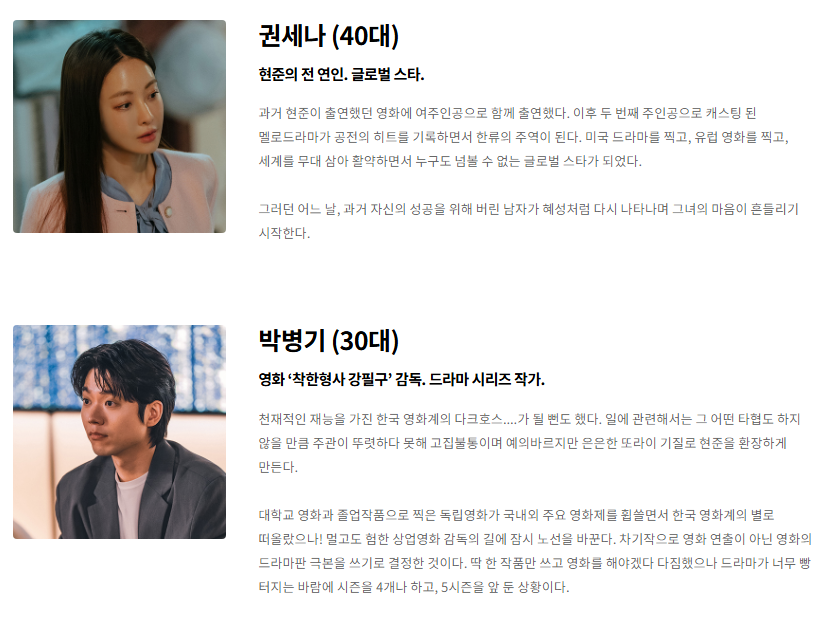 - 권세나(오연서, 보도/기사 언급): 현준의 과거 연인. ‘성공한 톱배우’로 상반된 길을 걷는다.