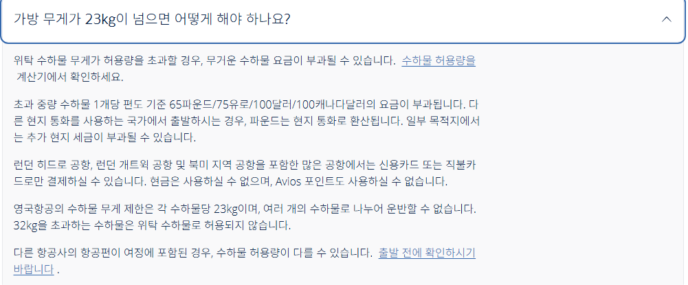 | 초과 수하물 | 23–32kg 추가 요금 £65 |