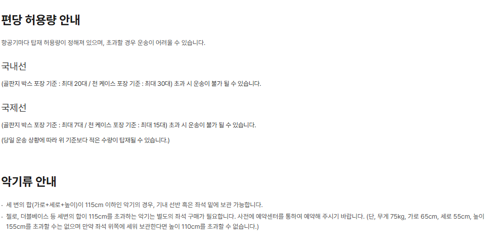 - 크기가 작은 악기(바이올린 등)는 기내 반입 가능