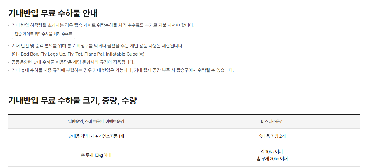 💡 체크인 시 또는 탑승구에서 무게·크기 측정 후 초과 시 위탁 수하물 전환 및 요금 부과됩니다.