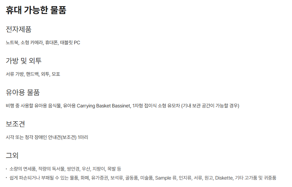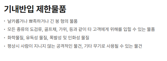 | 개인 소지품 (핸드백, 노트북, 쇼핑백 등) | 1개, 2kg 이하 |
