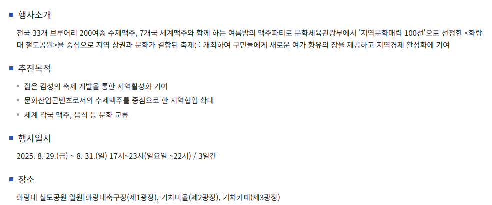 | 노원수제맥주축제 (NBF) | 8.29 ~ 8.31 | 화랑대 철도공원 | 수제맥주 200종, 북맥토크, 가족 체험 | 유료입장 + 시음권 구매 |