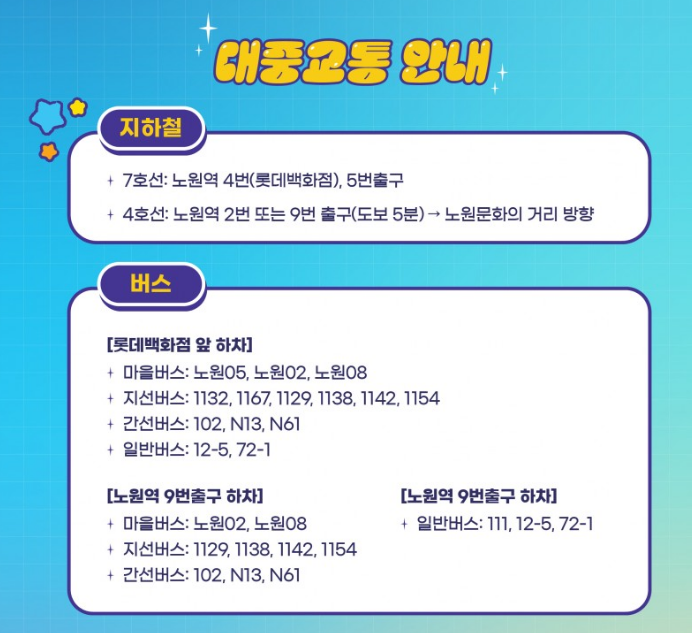 - 노원역 혹은 공릉동역 중심 접근 용이, 행사장마다 셔틀버스·대중교통 연계