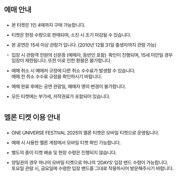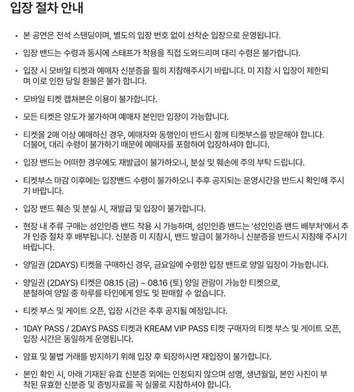 - 형식: 올 스탠딩, 선착순 입장, 손목밴드 수령 방식, 재입장 불가(일반 규정)
