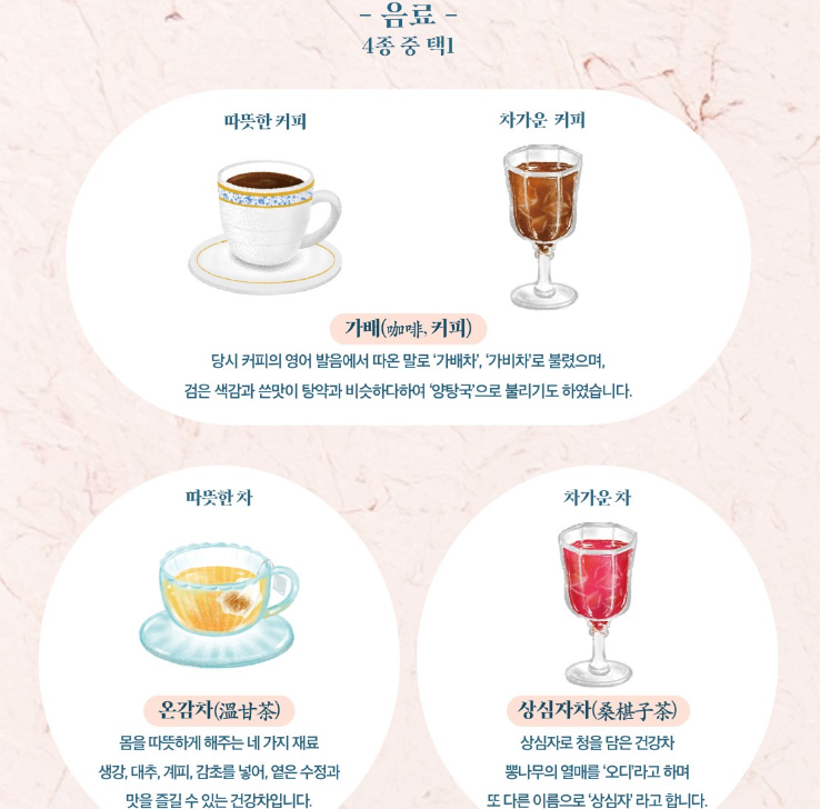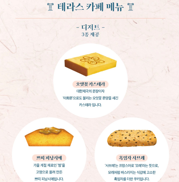 고종이 즐겼다는 가배(커피)를 현대적으로 재해석한 음료와 디저트를 테라스 야경 속에서 맛봅니다. 올 하반기 보도에 따르면 오얏꽃 카스테라·쁘띠 피낭시에·흑임자 사브레, 음료는 따뜻한/차가운 가배·오디차·온감차 중 택1 구성으로 소개되었습니다(현장·일자별 일부 변동 가능).
