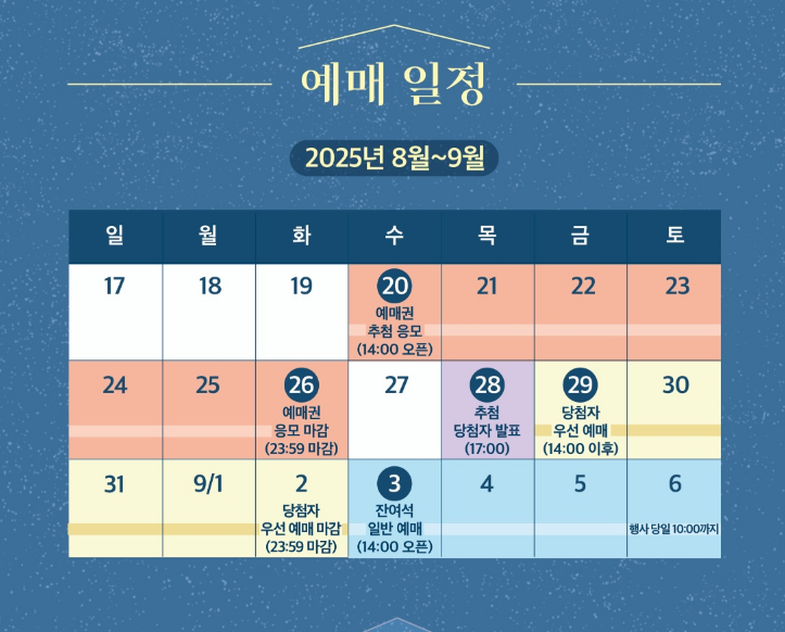 - 캘린더 블록: 응모 오픈(8/20 14:00), 당첨발표(8/28 17:00), 우선예매(8/29~9/2), 잔여석(9/3 14:00)을 휴대폰 일정에 직접 등록.