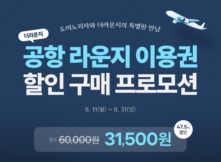 - 무엇: 자사앱으로 프리미엄 피자(예: 랍스터 슈림프 투움바, 불타는 랍슈투 등) 구매 시 인천·김포·김해 국제공항 ‘더라운지’ 이용권을 제휴(㈜이브릿지)로 할인가에 제공. (기간·매장·수량 제한, 선착순)