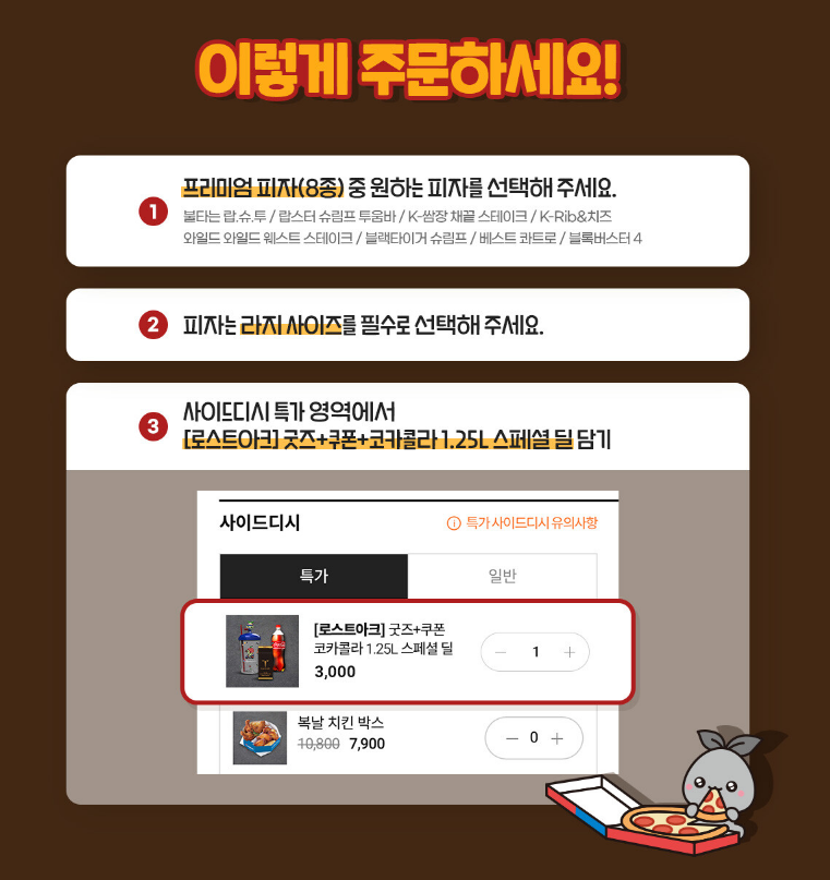 - 무엇: 자사앱에서 프리미엄 L 피자 주문 시, 로스트아크 굿즈 세트(피규어 콜드컵, 카드팩, 게임 쿠폰) + 코카콜라 1.25L를 3,000원에 구매 가능한 스페셜 딜. 매장별 한정·선착순, 1피자당 1회 적용. 기간: 8/14~9/14.