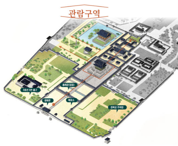 - 메인 라인: 광화문→흥례문→근정문/근정전→사정전→강녕전→교태전→아미산 → (수면 반사 미학) 경회루