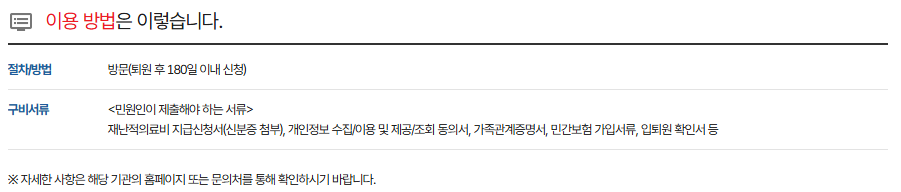 - 퇴원/최종진료 다음날부터 180일 내 신청. 접수 후 심사 → 결과 통지.