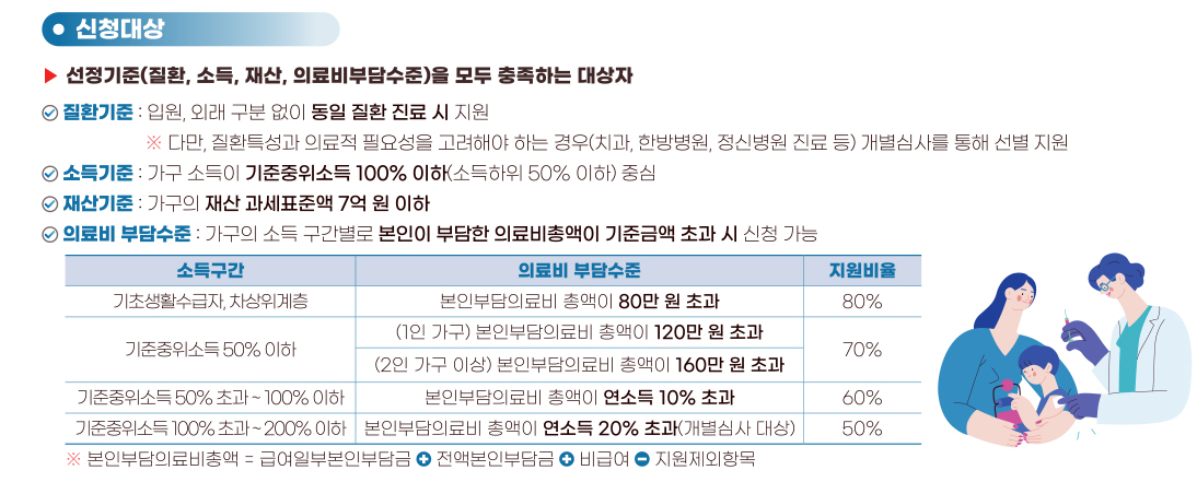 - 지원 항목: 비급여 + 본인부담상한제 적용 제외 급여 등. (중복 지원 제외 원칙: 타 법령·민간보험 등으로 이미 보전된 금액은 빼고 계산)